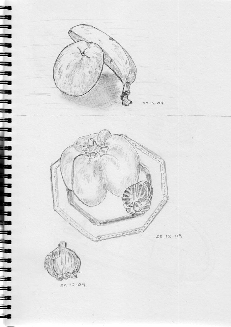 Apart from my musical activities, I am trying to keep to a resolution to do some sketching or painting each day. I have not been terribly imaginative in terms of my subjects which, so far, have amounted to a series of still fruit and vegetables. Well, I did do a pair of socks yesterday but I don’t think I will show you them!