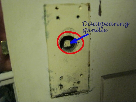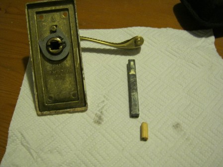 I went out to my garage workshop and pottered about. In the back of my mind I was thinking about a ball bearing or a small metal nut. Unfortunately, I could not find one that would fit the cavity of the outside brass handle. I then hit upon the idea of dropping a sawn off bit of a wooden dowling peg down the hole. In other words, I was not going to make the spindle longer, but I would force its position to change in a fashion that would be functionally equivalent to its extension. I sawed the peg, dropped it in the hole, gave the mechanism a squirt of WD40 for good measure, and reassembled it. My dear blogophiles, it worked! I felt very pleased with myself. Speak to you later.