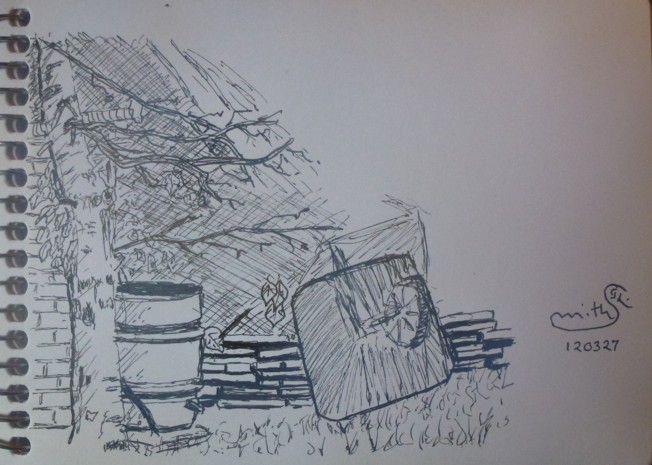When I got back, I sorted out a few large cardboard boxes for our recycling bin (perhaps I should have done that earlier and taken it straight to the tip, but I could not concentrate on anything until I had dealt with the old TV). I swept up a bit in the shed and put a sun lounger out on the lawn. Even though it is still March, it was beautifully warm out there. I had a cup of coffee while I drew the water butt (and the over-turned wheelbarrow is next to it).