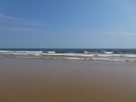 Sounds: white noise of waves gently breaking on the rocks. Occasional seagull cries