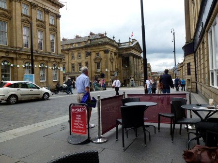 I sit at a table outside. The coffee is excellent and the panini is wonderful. I watch the ebb and flow of people and traffic moving up and down Grey street. Across the road a security guard nervously walks out of the bank clutching a small case which is, presumably, filled with cash. I suppose it could be his wife’s make-up bag but that might be overstretching the imagination somewhat. I have to be careful about doing that sort of thing or my author gives me a hard time. In fact I can feel that he is starting to close the pages of his notebook as I speak. By the time his pen is returned to his jacket breast pocket, I shall have temporarily ceased to exist. Speak to you later, my dear blogophiles.